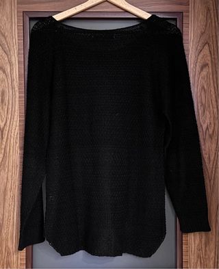 Suéter negro de tejido con un diseño moderno y cómodo. - Manga larga. - Cuello redondo. - Bajo asimétrico. aparte de atrás más larga.