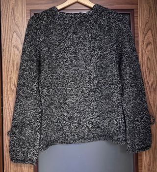 Suéter de punto con un diseño jaspeado en tonos negros y grises. Presenta detalles de lazadas en los puños con abalorios. - Tejido de punto jaspeado. - Mangas largas con lazada y abalorios. - Cuello redondo.