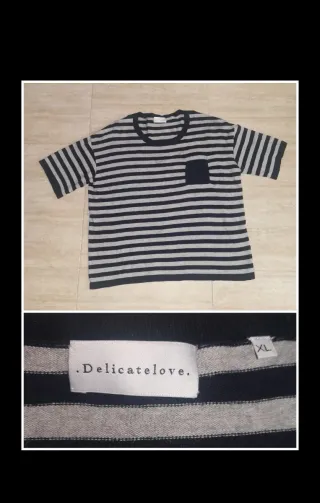 Vntd2 Ma2 *Suéter a listas/rayas horizontales, en tono azul marino y gris, de manga corta, en tejido 90% algodón y 10% cachemira, con escote redondo, el tejido da bastante de sí, para chica/mujer. De la marca Delicatelove, talla XL 42 Medidas: 55cm de sisa (110cm de contorno de pecho) 57,5cm de largo Las medidas también están en las fotos. Muy buen estado. Hago envíos