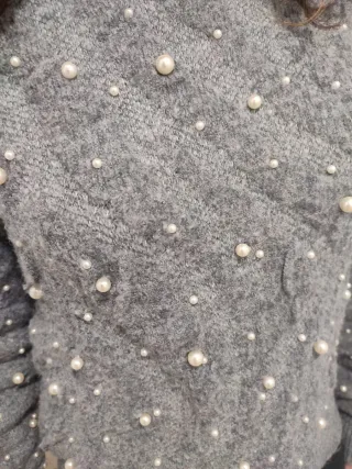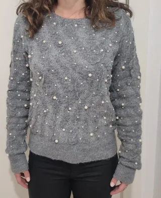 Jersey gris de Zara con detalle de perlas. - Diseño con perlas incrustadas. - Tejido de punto. - Manga larga. Temporada 2023.