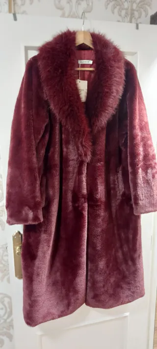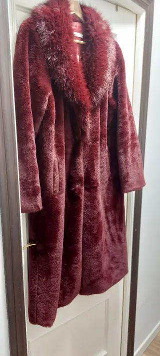 Elegante abrigo largo de pelo sintético con cuello de pelo. - Material: Pelo sintético suave. - Diseño: Abrigo largo con cuello de pelo. - Color: Rojo vino.