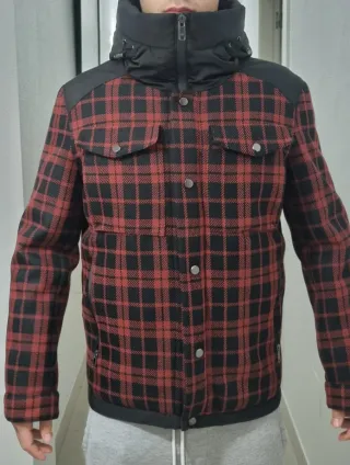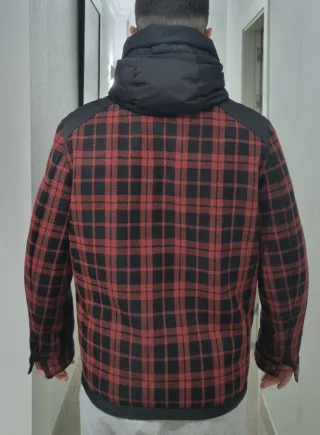 Cazadora con un llamativo diseño de cuadros. - Diseño de cuadros en rojo y negro. - Cuello alto con capucha. - Cierre de cremallera. - Bolsillos en el pecho.