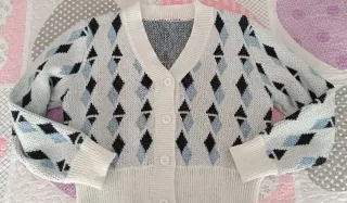 Rebeca de punto con un diseño de rombos en blanco, azul y negro. Es una prenda versátil y cómoda. - Diseño de rombos. - Cuello en V. - Cierre de botón.