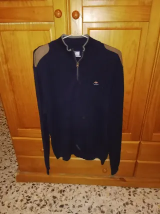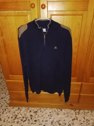 (Solo por 5€)En buen estado.Bonito Jersey o suéter para hombre mangas largas algo finito de punto,con cremallera lleva marrón en los hombros,le da un toque muy chulo. - Diseño con cuello alto y media cremallera. - Detalles en los hombros. - Logo bordado en el pecho.Talla 48 cm de axila a axila.Si te interesa te lo envío por tan y 5€ MIRA MI PERFIL - NO TE LO PUEDES PERDER 🤗