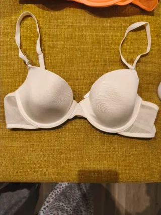 Conjunto de tres sujetadores talla 75B. Colores beig, lila y naranja. Sin uso. Como nuevos