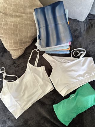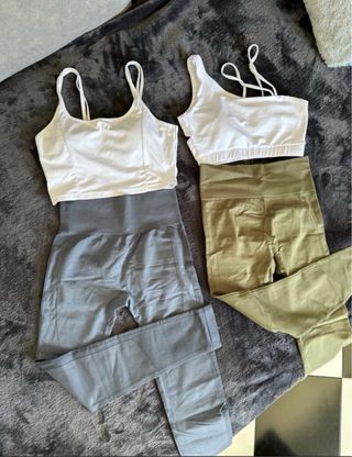 Conjunto de ropa deportiva sin estrenar, ideal para tus entrenamientos. - Incluye tops y leggings largos - Diseño moderno y cómodo.