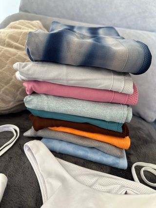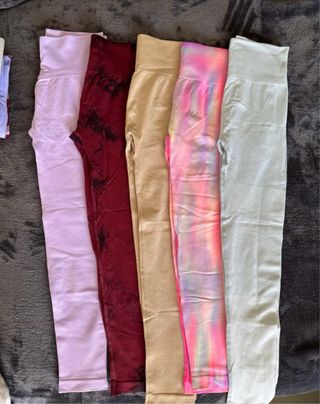 Conjunto de ropa deportiva de talla S. - Pantalones de color rosa, beige, azul claro, lila y fucsia con estampado. - Tejido elástico y cómodo. incluye 3 tops, dos de ellos blancos y uno verde. diversos legging de diferentes colores la unidad del legging sale a 7€ cada uno lote de 3 legging 15€ lote de 6 legging 40€ lote de 10 legging 60€