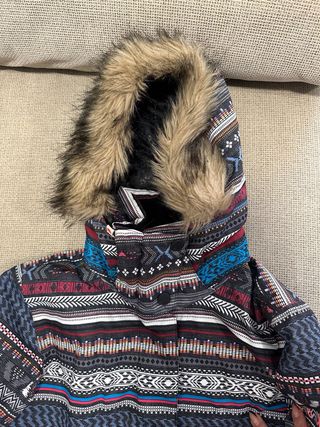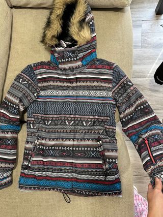 Chaqueta Roxy con un diseño vibrante y llamativo. - Estampado geométrico multicolor. - Capucha con pelo sintético. - Bolsillos frontales con cremallera. - Puños ajustables.