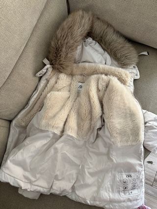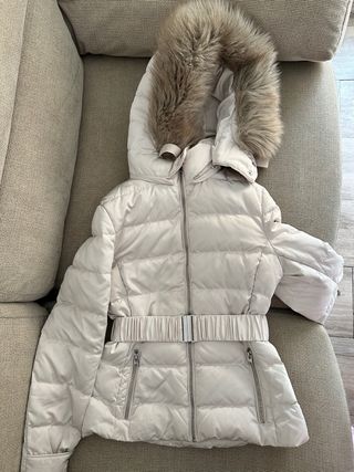 Abrigo de invierno con capucha y cinturón. - Diseño con plumas - Capucha con pelo. - Cinturón elástico con hebilla. - Bolsillos con cremallera.