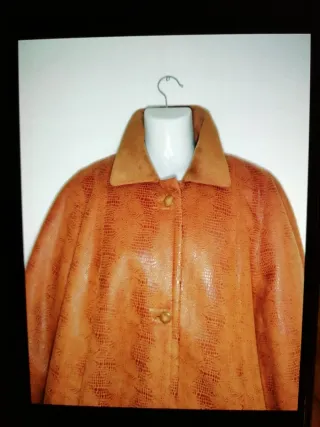 Elegante chaquetón para señora con un diseño texturizado y un acabado que simula piel de reptil. Ideal para añadir un toque sofisticado a tu vestuario. No lleva etiquetas, asegúrate bien de las medidas, por favor!! Medidas: hombros 42cm, de axila a axila 61cn, largo de manga 63cm y largo 88cm. Abriga muchísimo. - Cierre de botones. - Cuello camisero. - Puños y cuello con detalle en ante.