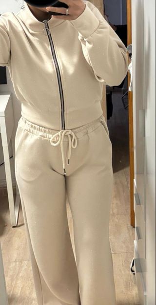 Conjunto deportivo de dos piezas para mujer. - Chaqueta con cremallera. - Pantalón con cordón ajustable en la cintura. - Tejido con pequeños detalles brillantes. precio 25€ cada chandal