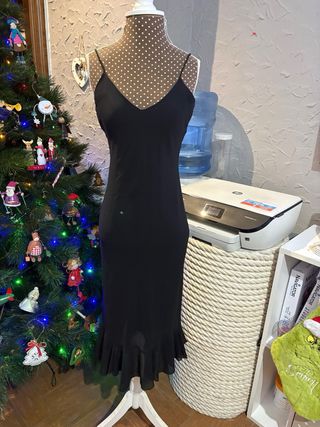 Elegante vestido negro con tirantes finos y un detalle de volantes en el bajo. Por detrás leve cola. 🔸Medidas en fotos, pero da algo más porque está medido por fuera, el forro da más de sí porque tiene elastano. 🔸Para XS y S - Diseño de corte recto. - Tejido ligero y fluido. - Largo midi.