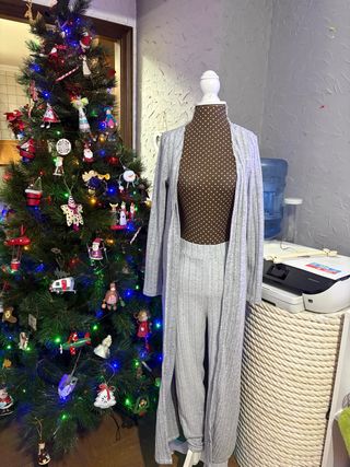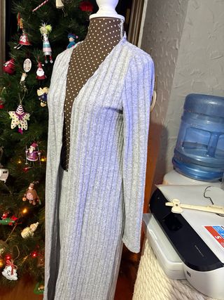 Conjunto de dos piezas en tejido de canalé de punto. ⭕️talla XS pero válido para S también Cárdigan talla XS pero más bien es talla única. - Cárdigan largo con abertura frontal. - Pantalón de cintura elástica.