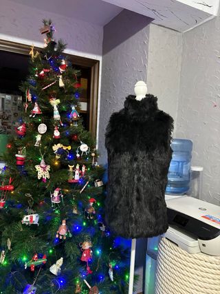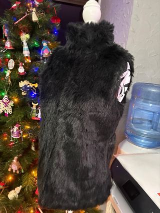 Elegante chaleco de pelo sintético. Puesto en dos ocasiones. - Diseño sin mangas. - Cuello alto. - Corchetes desde cuello hasta abajo. Dependiendo medidas talle y pecho , puede ir bien para talla M , al menos abierto seguro que si...