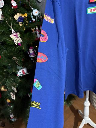 Camiseta de manga larga con diseño inspirado en Kwik-E-Mart. ⭕️Aunque es talla M , pongo medidas porque viene muy amplia y creo que puede ir bien hasta XL. - Estampado frontal del logo Kwik-E-Mart. - Ilustraciones temáticas en la manga izquierda. - Cuello redondo y manga larga.