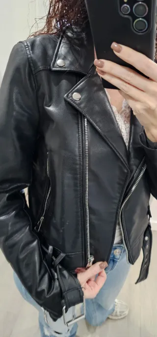Cazadora estilo biker de Zara, con un diseño moderno y atemporal. - Cierre de cremallera. - Bolsillos frontales con cremallera. - Cinturón con hebilla. - Puños con cremallera.