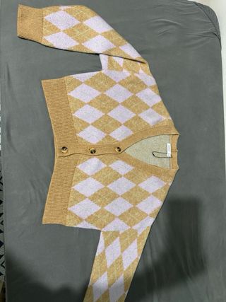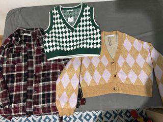 Conjunto de tres prendas de ropa para mujer. - Chaleco de punto con estampado de rombos en verde y blanco. - Cárdigan de punto con estampado de rombos en beige y lila. - Camisa de cuadros en tonos burdeos, negro y blanco.