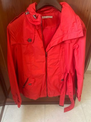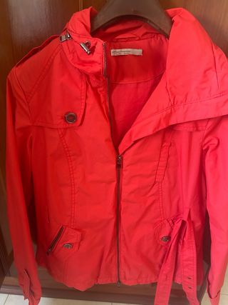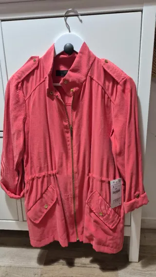 Chaqueta de la marca Zara, con su etiqueta original. - Diseño con cuello - Cierre de cremallera - Bolsillos delanteros con botón - Cintura ajustable con cordón - Puños enrollados Color coral Tiene una pequeña mancha en la espalda que no pude quitar, aparece en una de las fotos De hombro a hombro mide 39cm y de largo 65cm Precio en tienda 39.95