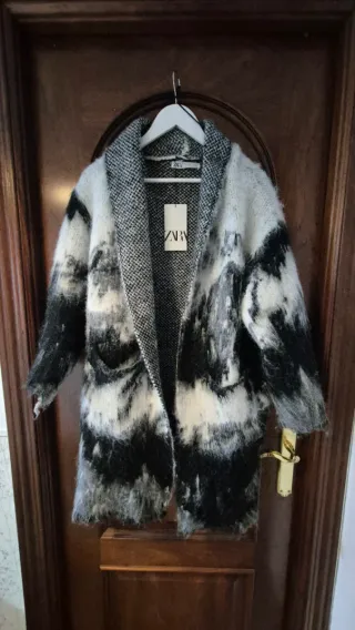 Abrigo de Zara con un diseño moderno y llamativo, perfecto para añadir un toque especial a tu look. - Estampado abstracto en blanco y negro. - Corte abierto. - Bolsillos laterales. - Material suave y cálido. Desde el cuello a la sisa mide 27cm Desde la sisa a el final de la manga 46cm Largo total 90cm Precio en tienda 59.95