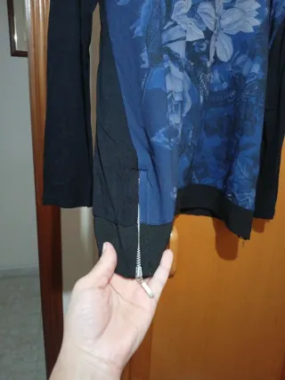 Blusa de manga larga con un llamativo estampado floral. - Diseño frontal con flores en tonos azules y blancos. - Mangas y espalda en color negro. - Detalle de cremallera en el bajo.