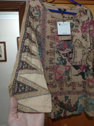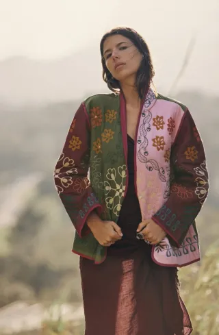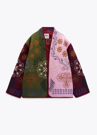 Cazadora de Zara con un diseño único y llamativo. - Patchwork de diferentes tejidos y colores. - Detalle de bordados florales y geométricos. - Corte recto y manga larga.