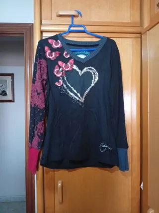 Jersey de manga larga con un diseño llamativo. - Detalle de mariposas en la zona del hombro. - Corazón central con lentejuelas y texto. - Manga izquierda con estampado floral. - Puños de diferentes colores.