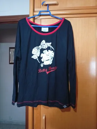Camiseta negra de manga larga con estampado de Betty Boop. - Cuello redondo con ribete rojo. - Puños y bajo con pespuntes rojos. - Estampado frontal de Betty Boop con lazo.
