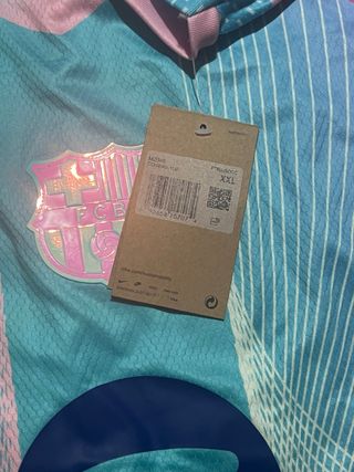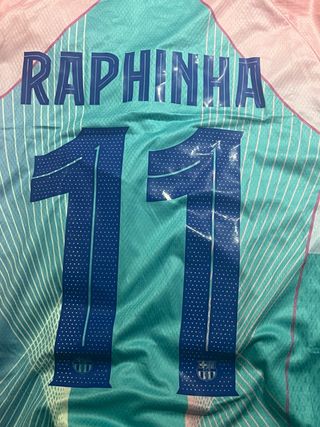 Camiseta de fútbol de Raphinha, número 11. - Diseño con detalles en azul y turquesa. - Logo de Nike. - Escudo del club en la parte inferior.