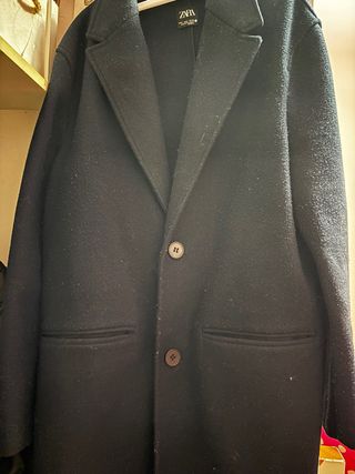 Abrigo elegante de Zara, perfecto para ocasiones formales o para el día a día. - Diseño clásico con solapa. - Cierre de botones. - Bolsillos frontales.