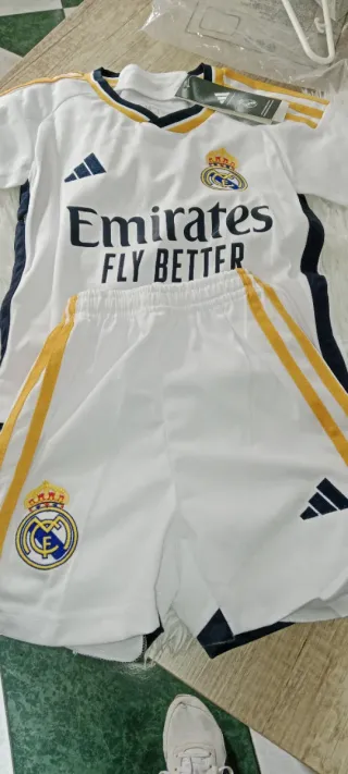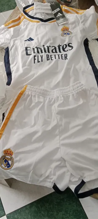 Conjunto deportivo del Real Madrid para niños y niñas. - Camiseta blanca con detalles dorados y azules. - Pantalón corto blanco con detalles dorados.