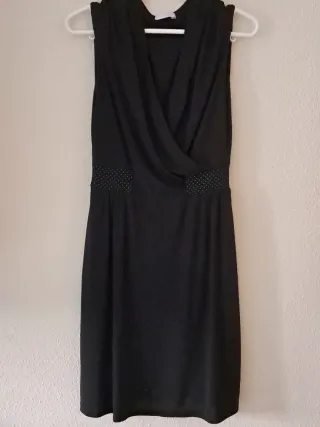 Elegante vestido negro con diseño cruzado. - Mangas cortas. - Cintura con detalle de puntos. - Corte favorecedor. - De 90 cm largo.