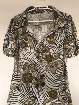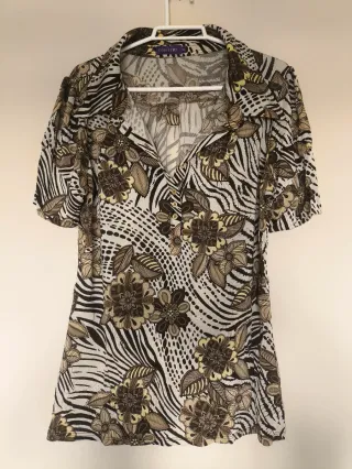 Camiseta de manga corta con un llamativo estampado floral y animal print. - Diseño con cuello camisero. - Cierre de botones en la parte delantera. - Tejido ligero y cómodo.