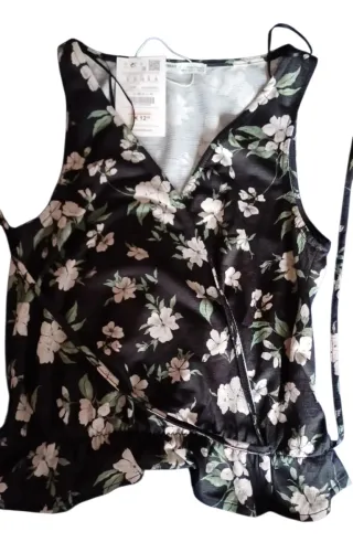 Top cruzado con estampado floral de la marca Pull&Bear. Es una prenda nueva con su etiqueta original. - Diseño cruzado. - Estampado floral. - Sin mangas. - Detalle de volante en el bajo.