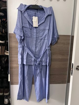 Conjunto de dos piezas de Zara, compuesto por camisa L y pantalón M. - Camisa con cuello - Pantalón de corte recto - Cinturón a juego - Tejido de lino