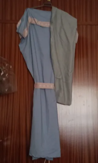 Conjunto de túnica romana con cinturón y tela adicional. - Túnica de color azul claro. - Adorno de cinta rosa con cenefa en el cuello y cintura. - Incluye tela adicional de color gris pálido.
