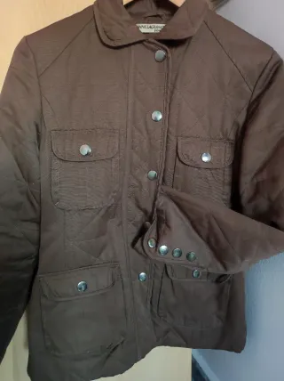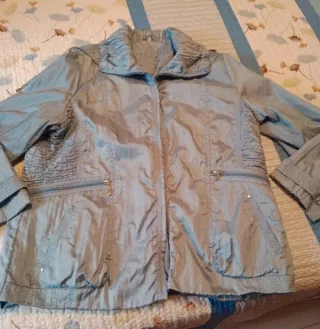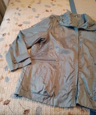 Chaqueta tipo parka, ideal para entretiempo. Aunque pone talla 46 talla grande, MEDIDA DE AXILA A AXILA 65 CENTÍMETROS - Diseño con cuello alto y fruncido. - Cierre de cremallera. - Dos bolsillos laterales con cremallera. - Bolsillos inferiores con solapa y botón. - Mangas largas con puños abotonados.