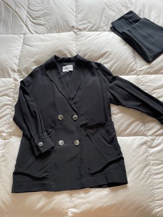 Conjunto de chaqueta y pantalon Bimba y Lola, en color gris oscuro. Chaqueta 36 y pantalón 38 (para una persona de talla 38 vale todo) - Chaqueta de corte clásico. - Cierre de doble botón. - Bolsillos frontales. - Puños abotonados. - Pantalón vuelta - Bolsillos laterales - Modal y viscosa divinos