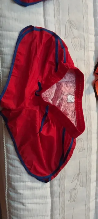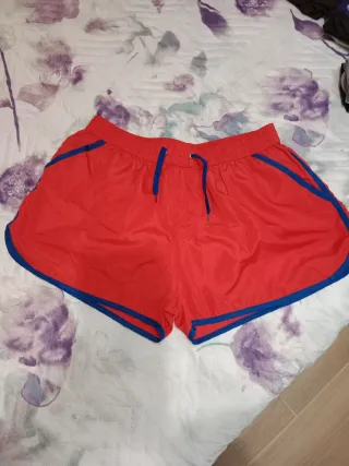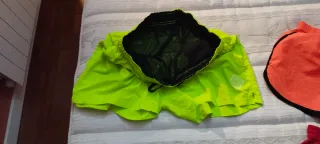 Conjunto de dos pantalones cortos, ideales para el verano o para la práctica deportiva. Uno es de color rojo con ribetes azules y el otro es de color amarillo neón. - Cintura elástica con cordón. - Tejido ligero y de secado rápido. Ambos tienen forro interior. El rojo tiene bolsillos traseros con cierre de velcro El amarillo neón tiene bolsillos delanteros y un bolsillo trasero con cierre de velcro