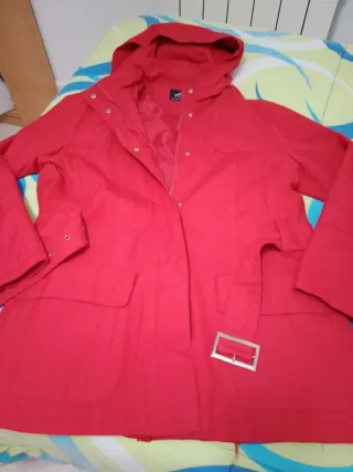 Chaqueta parka de color rojo, ideal para mujer. Talla XL - Diseño con capucha desmontable. - Cierre de cremallera y botones. - Cinturón con hebilla plateada. - Dos bolsillos frontales con solapa. - Forro interior
