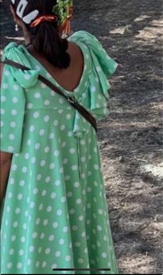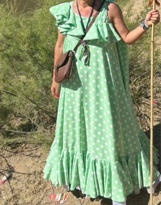Bata flamenca con un diseño alegre y llamativo. - Estampado de lunares blancos sobre fondo verde. - Volantes en mangas y bajo. - Diseño largo y vaporoso.