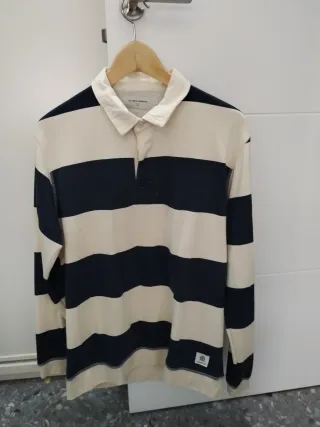 Camiseta de manga larga con un diseño de rayas clásico. - Cuello tipo polo con botones. - Rayas horizontales en azul marino y beige. - Detalle de pespuntes en contraste en los bajos y puños.