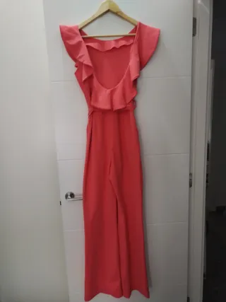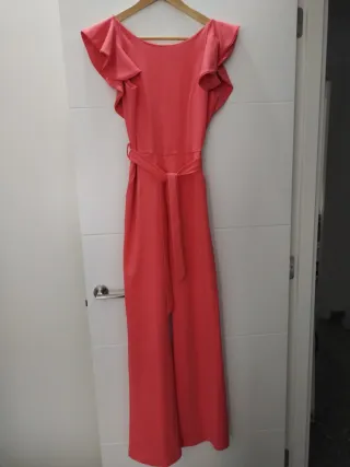 Mono elegante de color coral, con mangas acampanadas y cinturón. - Mangas con volantes. - Cinturón a juego. - Piernas anchas.