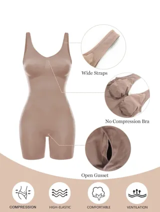 Body moldeador de color beige, diseñado para estilizar la figura. - Tirantes anchos. - Sin sujetador de compresión incorporado. - Refuerzo abierto en la entrepierna. - Tejido de alta elasticidad. - Cómodo y transpirable.