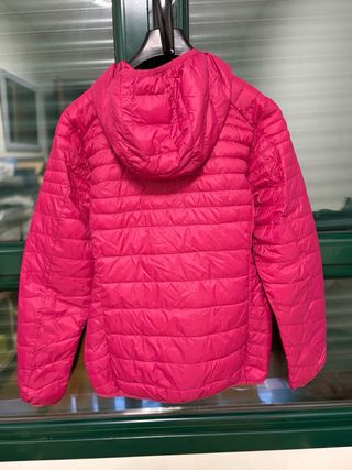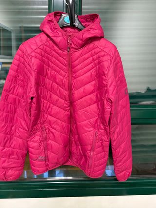 Cortavientos deportivo de Decathlon, ideal para actividades al aire libre. Es ligero y fácil de llevar. - Diseño acolchado con costuras en zigzag. - Capucha integrada. - Cierre de cremallera frontal. - Dos bolsillos laterales con cremallera.