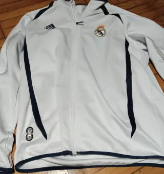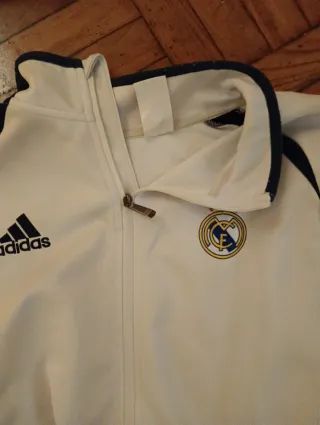 Chándal de paseo del Real Madrid. Sudadera con cremallera y dos bolsillos también con cremallera. Pantalones como nuevos. Dos bolsillos también con cremalleras. Tiene una pequeña mancha en la espalda, prácticamente imperceptible. ( Última foto) Las letras de la publicidad de Adidas casi perfectas. Escudo y publicidad de Adidas bordados. Muy buen estado.