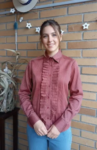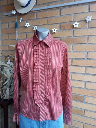Camisa de Zara con un diseño de rayas verticales en tonos rosas y rojos. Presenta un detalle de volantes en la parte frontal. - Cuello camisero. - Manga larga. - Cierre de botones.