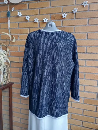 Lote de cuatro prendas de ropa para mujer en talla M. - Cárdigan azul marino con botones.[Nuevo] - Jersey de punto marrón y blanco.[Nuevo] - Camiseta crema con detalles de macramé y pedrería.[3 usos] - Jersey negro con detalle de cinturón.[Nuevo] Quedo en Gijón u Oviedo.
