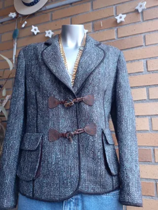 Elegante blazer de lana con un diseño tejido que combina tonos grises y verde azulado. Presenta detalles de cuero en los cierres y bolsillos. - Cierre de tipo toggle con cordón y cuero. - Bolsillos frontales con solapa. - Ribete de cuero en cuello y bordes.