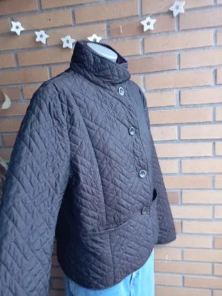 Abrigo tipo chaquetón para mujer, ideal para el frío. - Diseño acolchado con costuras en rombos. - Capucha forrada de borreguito. - Cierre de cremallera. - Bolsillos con solapa y botón. - Cordones ajustables en la capucha.