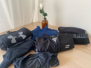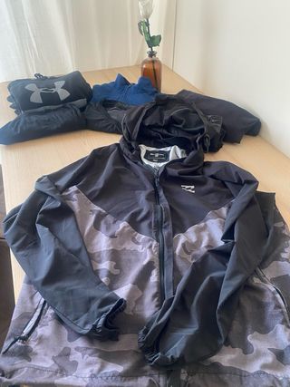 Conjunto de ropa deportiva para hombre. - Sudadera con logo grande de Under Armour. - Chaqueta azul con cremallera. - Chaqueta negra con logo de Billabong. - Pantalones negros. - Mallas Nike Pro. Camiseta....